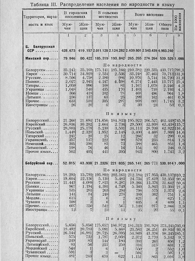 Пра выкарыстанне многіх моў на беларускіх тэрыторыях сведчыць і ўсеагульны перапіс насельніцтва, які правялі савецкія ўлады ў 1926 годзе. На той момант у Савецкай Беларусі налічылі амаль пяць мільёнаў жыхароў. Большасць з іх адзначала роднай мовай беларускую, на другім месцы — руская, на трэцім — ідыш, на чацвёртым — польская.