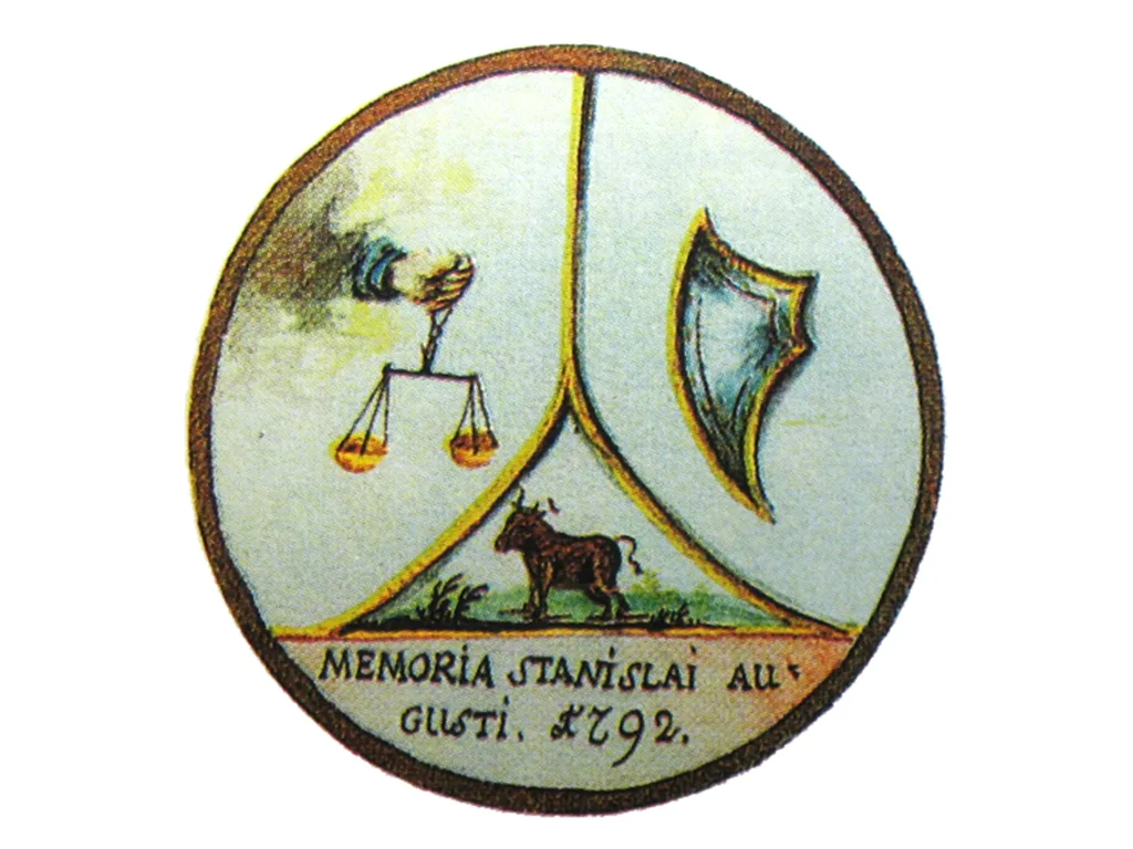 22  мая 1792 года Станіслаў Аўгуст пацвердзіў магдэбургскае права Ашмянаў, а яшчэ зацвердзіў для горада герб. Так з’явіўся першы герб: сярэбранае поле шчыта было падзеленае на тры часткі, у правай частцы рука трымае залатыя вагі, у левай частцы — тарк, а ўнізе выява чырвонага цяляці.