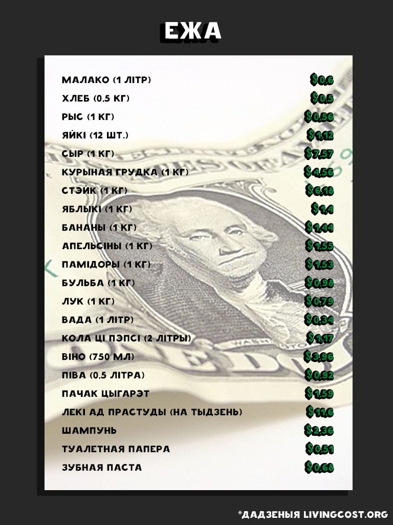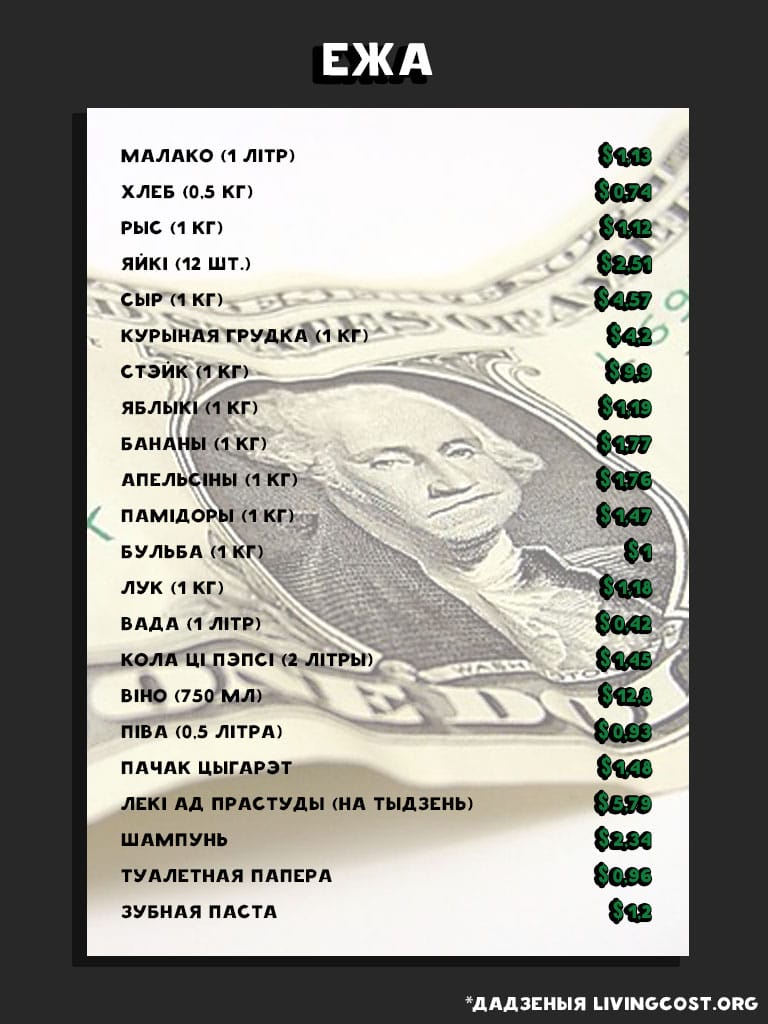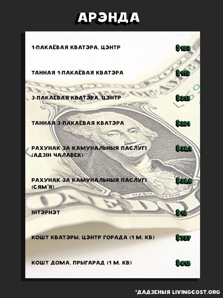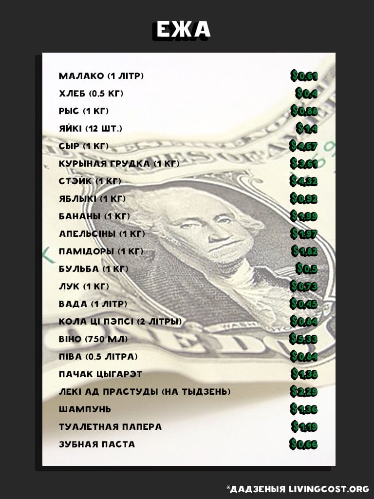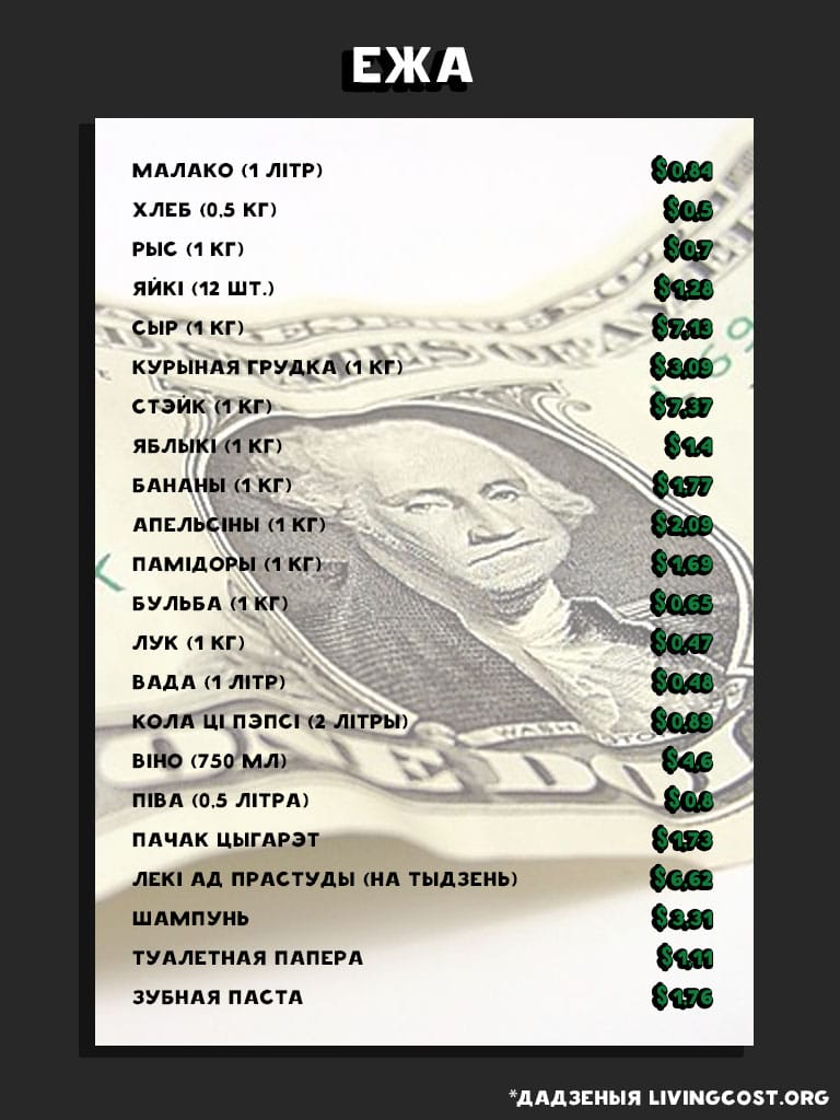 Месяц жыцця ў Беларусі каштуе ў сярэднім 579 долараў: гэта ў 1,69 разу ніжэй за сярэднесусветны паказчык. Беларусь знаходзіцца на 151-м месцы са 197 даследаваных краін па кошце жыцця. Бліжэйшыя нашы суседзі: Літва знаходзіцца на 71-м месцы (1 007 долараў у месяц), Латвія — на 79-м месцы (972 долары ў месяц), Польшча — на 86-м месцы (за месяц жыцця там трэба плаціць у сярэднім 912 долараў), Расія займае 110-ы радок (787 долараў у месяц), Украіна — на 185-й пазіцыі (у месяц трэба плаціць каля 480 долараў).