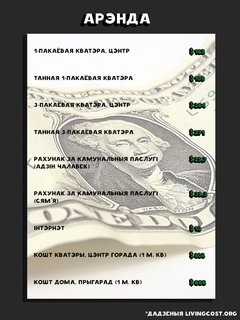 Сярэдні кошт жыцця ў Мінску складае 739 долараў — беларуская сталіца з’яўляецца адным з самых недарагіх сталічных гарадоў свету. Без арэнды жылля сярэдні кошт жыцця ў Мінску складае 415 долараў. Сярэдні заробак пасля выплаты падаткаў — 562 долары.